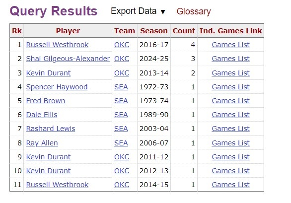 根據數據統(tǒng)計,這是亞歷山大本賽季第4次砍下50+,他追平威少,并列雷霆隊史單賽季50+場次榜榜首。