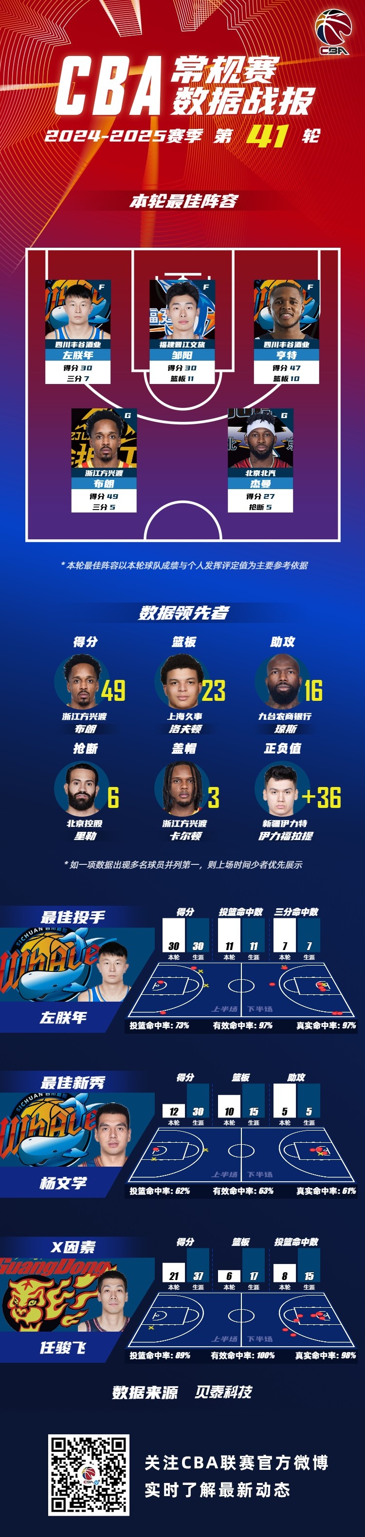 2024-2025賽季CBA聯(lián)賽常規(guī)賽第41輪結(jié)束較量,來(lái)自四川藍(lán)鯨的左朕年和亨特,福建潯興的鄒陽(yáng),浙江廣廈的布朗,北京首鋼的杰曼入選CBA聯(lián)賽常規(guī)賽第41輪最佳陣容!
