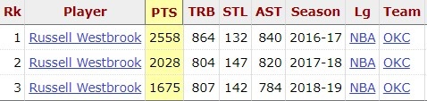 - 威少目前總得分、助攻和搶斷都進(jìn)了歷史前20 僅他和詹姆斯做到