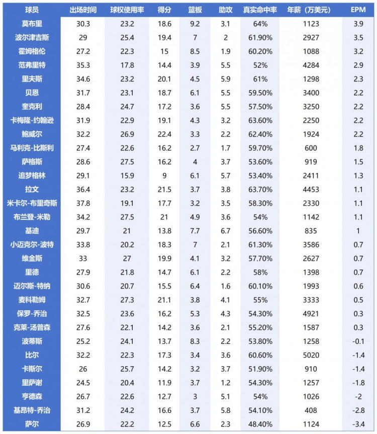 論綜合影響力,具備超強(qiáng)防守影響力的高大內(nèi)線優(yōu)勢巨大。30位三當(dāng)家EPM排行榜,莫布里、波爾津吉斯和霍姆格倫分列1-3位,他們所效力的球隊(duì)均是本賽季勝率前3位的強(qiáng)隊(duì)??紤]到他們3人攻防兼?zhèn)?,這個(gè)結(jié)果不讓人意外。