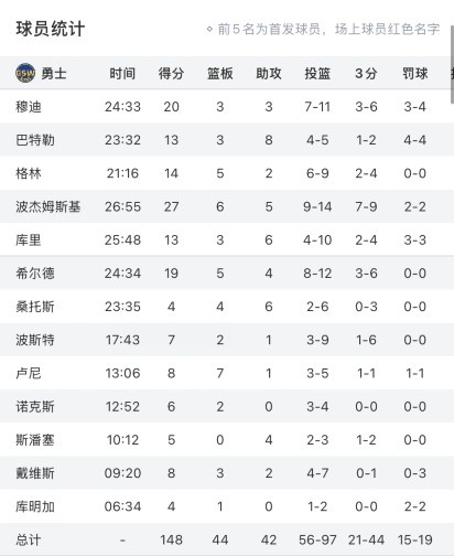 - 全員發(fā)揮!勇士出戰(zhàn)13人全部都有得分入賬 庫(kù)追巴只出戰(zhàn)3節(jié)