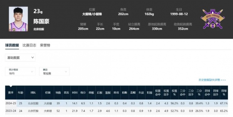 場均出戰(zhàn)26.5分鐘,得8.3分6.2籃板(2.8前場籃板國內(nèi)球員第6)1.8助攻1.0搶斷0.5封蓋,命中率49.3%,罰球命中率69.9%