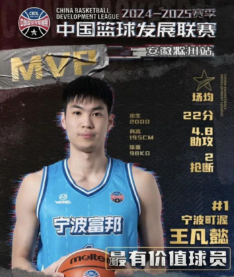 于是,王凡懿就只能去CBDL發(fā)光發(fā)熱了,不出意料的是,他在這里如魚得水……第二階段滁州站比賽,寧波在他的帶領(lǐng)下6戰(zhàn)全勝,王凡懿也以場均22分4.8助攻2搶斷收獲賽事MVP……