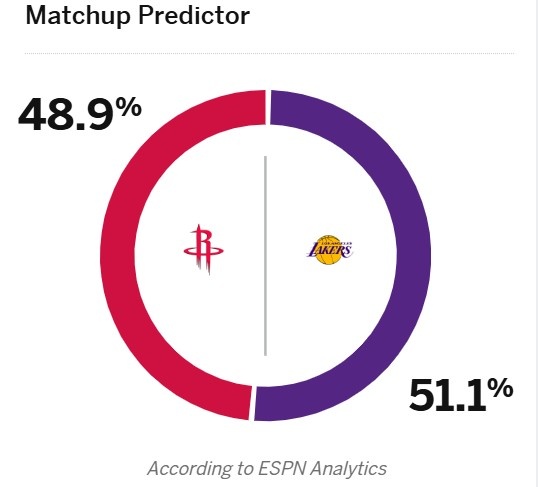 今天,ESPN預(yù)測本場比賽勝率,湖人51.1%略占優(yōu)勢,火箭(背靠背第二戰(zhàn))48.9%。