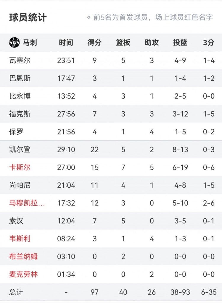 本場比賽,馬刺首發(fā)球員均表現低迷、沒有人得分上雙。具體如下: