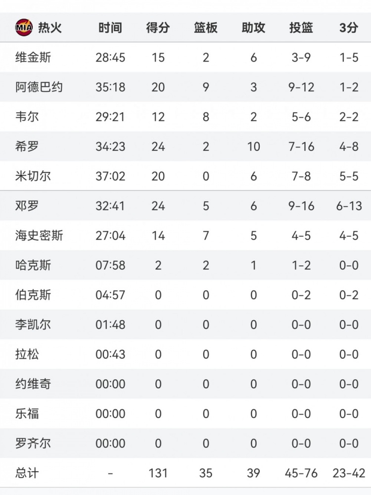 本場比賽,熱火全隊(duì)多點(diǎn)開花、共有7人得分上雙、4人得分20+,具體如下: