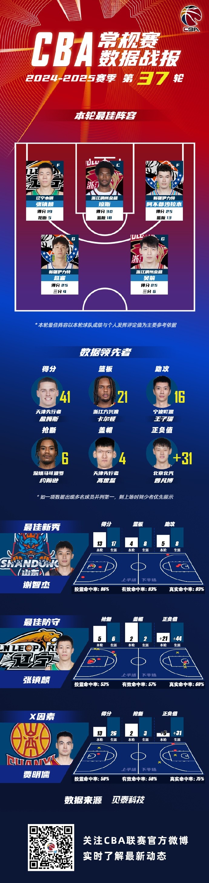 2024-2025賽季CBA聯(lián)賽常規(guī)賽第37輪結(jié)束較量,來(lái)自遼寧沈陽(yáng)三生飛豹籃球俱樂(lè)部的張鎮(zhèn)麟 ,浙江稠州籃球俱樂(lè)的瓊斯和吳前 ,新疆廣匯籃球俱樂(lè)部的阿不都沙拉木和趙睿入選CBA聯(lián)賽常規(guī)賽第37輪最佳陣容!