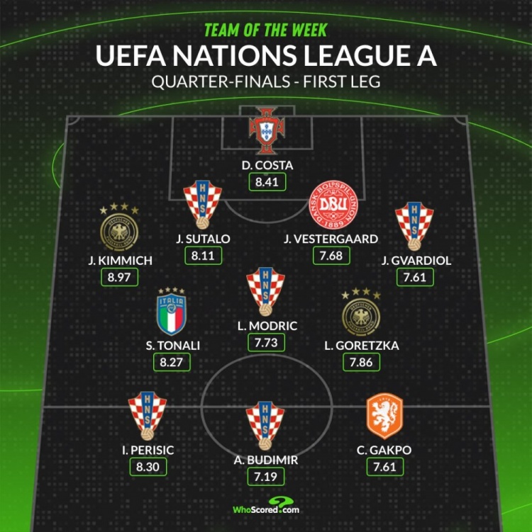 3月21日訊 歐國聯(lián)A級別八強戰(zhàn)首回合已經(jīng)完賽,whoscored也列出了本輪評分最佳陣容,克羅地亞5將在列。