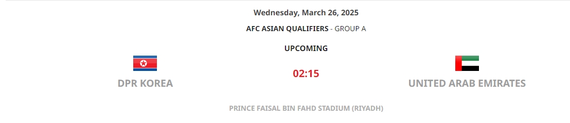 亞足聯(lián)官網(wǎng)顯示:朝鮮主場對陣阿聯(lián)酋,將在沙特利雅得進(jìn)行