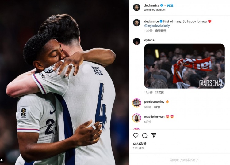 作為雙料隊友的老大哥賴斯也在賽后通過社媒曬出兩人的擁抱照,并配文:“未來眾多進球里的第一個!我為你感到非常開心??@斯凱利”。