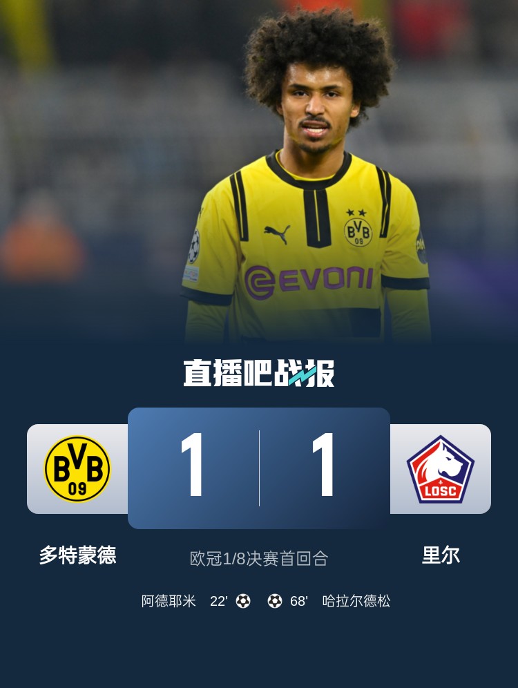 歐冠1/8決賽首回合,多特1-1里爾。上半場(chǎng),阿德耶米造險(xiǎn)+貼地?cái)仄崎T(mén),格羅斯進(jìn)球被吹;下半場(chǎng),哈拉爾德松扳平比分。