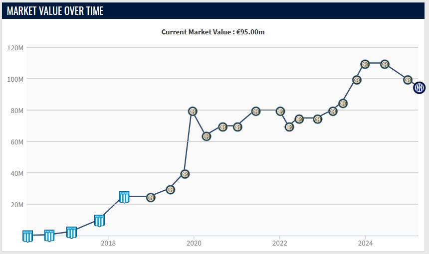 下跌500萬!27歲勞塔羅最新身價為9500萬歐,最高身價曾達1.1億歐