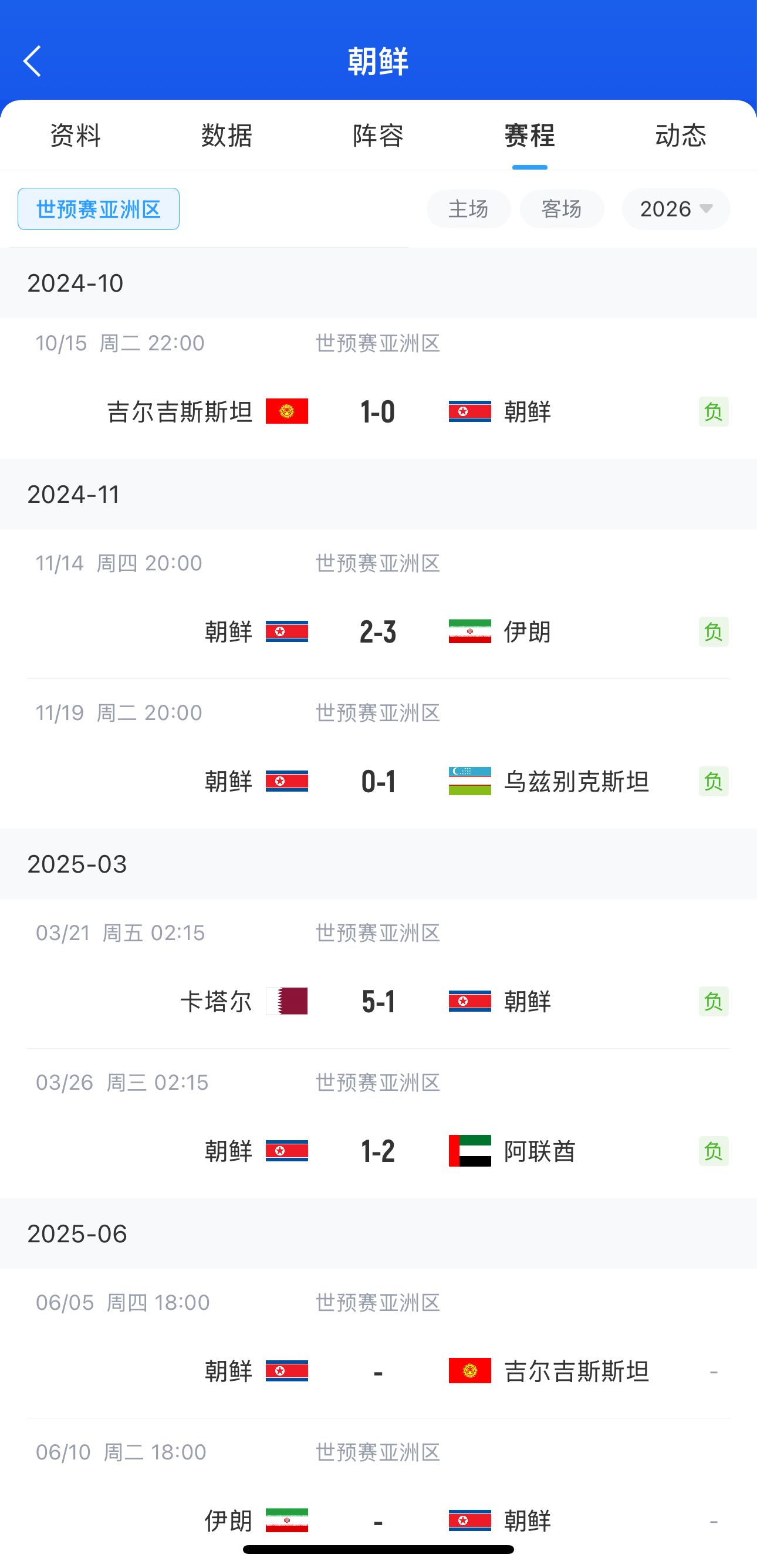 8輪過后,朝鮮2平6負(fù)未嘗一勝僅積2分,進(jìn)7球、丟16球、凈勝球-9,剩2輪落后同組第4卡塔爾8分,朝鮮提前2輪從18強賽出局,成為本屆首支出局球隊。
