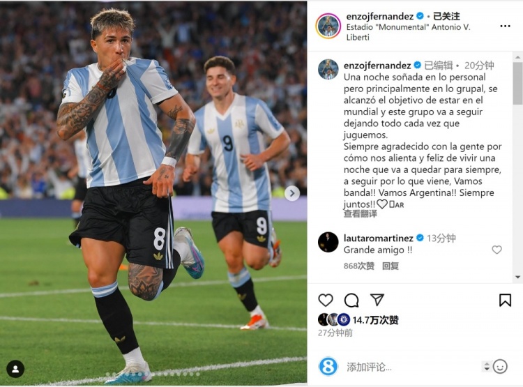 “永遠(yuǎn)感激球迷們對(duì)我們的支持,很高興經(jīng)歷一個(gè)將被永遠(yuǎn)銘記的夜晚。讓我們?yōu)榻酉聛?lái)的挑戰(zhàn)將繼續(xù)努力!加油,兄弟們!加油,阿根廷!永遠(yuǎn)團(tuán)結(jié)一致!”