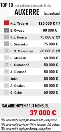因此,歐塞爾俱樂部(AJA)雖然僅需承擔(dān)以下租借球員月薪的一半:由伯恩茅斯租借的科特迪瓦進(jìn)攻中場哈梅德·朱尼爾·特拉奧雷(25歲,歐賽爾承擔(dān)24萬歐元中的12萬)、由狼隊租借的荷蘭右后衛(wèi)基-加納·霍福爾(23歲,歐賽爾承擔(dān)15萬歐元中的7.5萬),以及由伯恩利租借的中場漢-諾阿·馬森戈(23歲,歐賽爾承擔(dān)12萬歐元中的6萬),馬森戈是合同中唯一包含買斷選項的球員,這個價格也使得這三位球員分別位列俱樂部薪資榜的第一、第三和第五位。