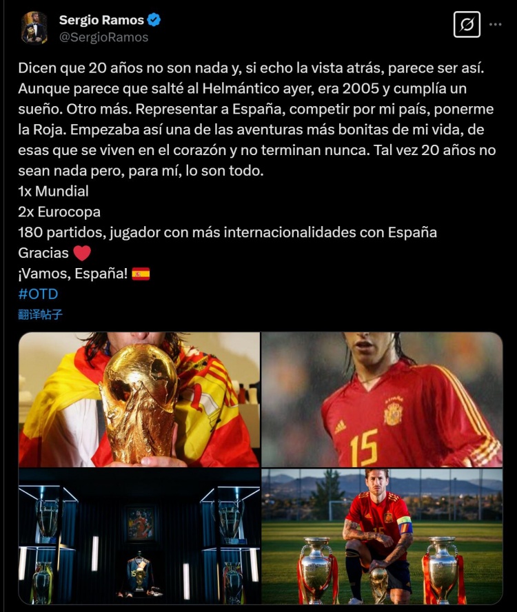 - 拉莫斯更新社媒,慶祝他代表西班牙國家隊(duì)首秀20周年
