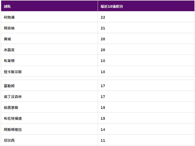盤點(diǎn)各隊(duì)過去10輪聯(lián)賽的戰(zhàn)績(jī),曼城狀態(tài)不錯(cuò),拿到了20分。同樣20分的還有水晶宮,如果他們能延續(xù)這樣的狀態(tài),沖擊隊(duì)史首個(gè)歐戰(zhàn)資格并非遙不可及。