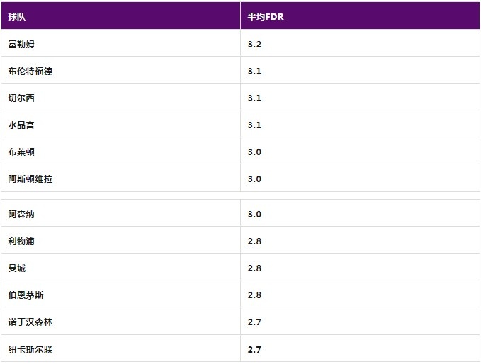 前12名球隊(duì)剩余聯(lián)賽賽程平均FDR
