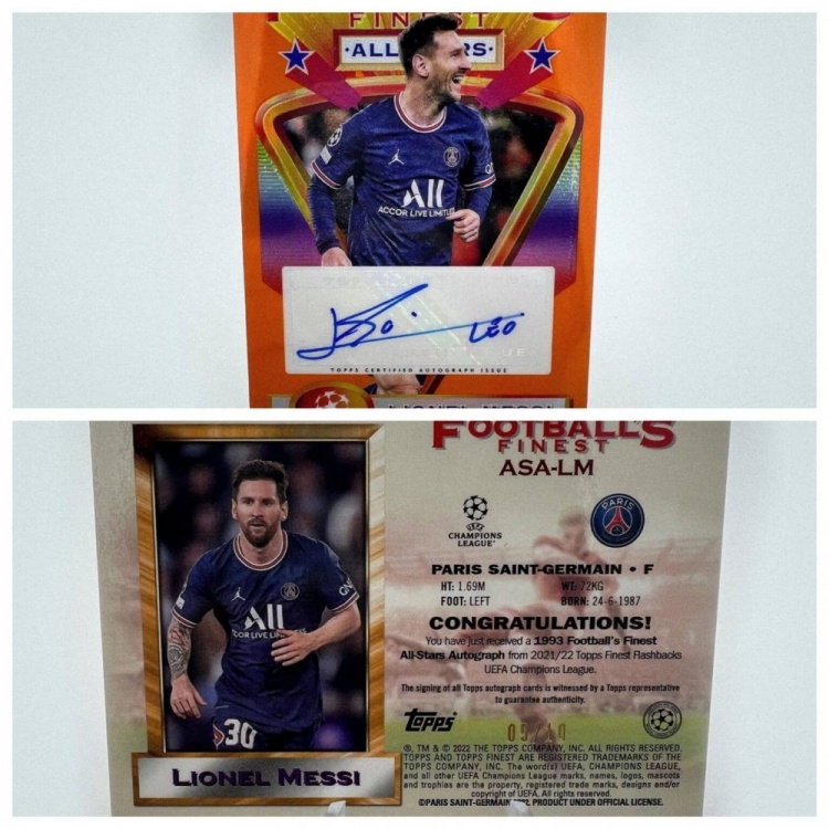 這張2021-22賽季Topps Finest Flashbacks UEFA Champions League Football’s Finest全明星簽名橙折射卡,全球僅印制10張。正面小字標(biāo)注著“Topps認(rèn)證簽名版本”。卡片背面還提供了更多保證:“所有Topps簽名卡的簽署過程均有Topps代表現(xiàn)場監(jiān)督,確保真實(shí)性。”這張卡片潛在價(jià)值超過1000美元。