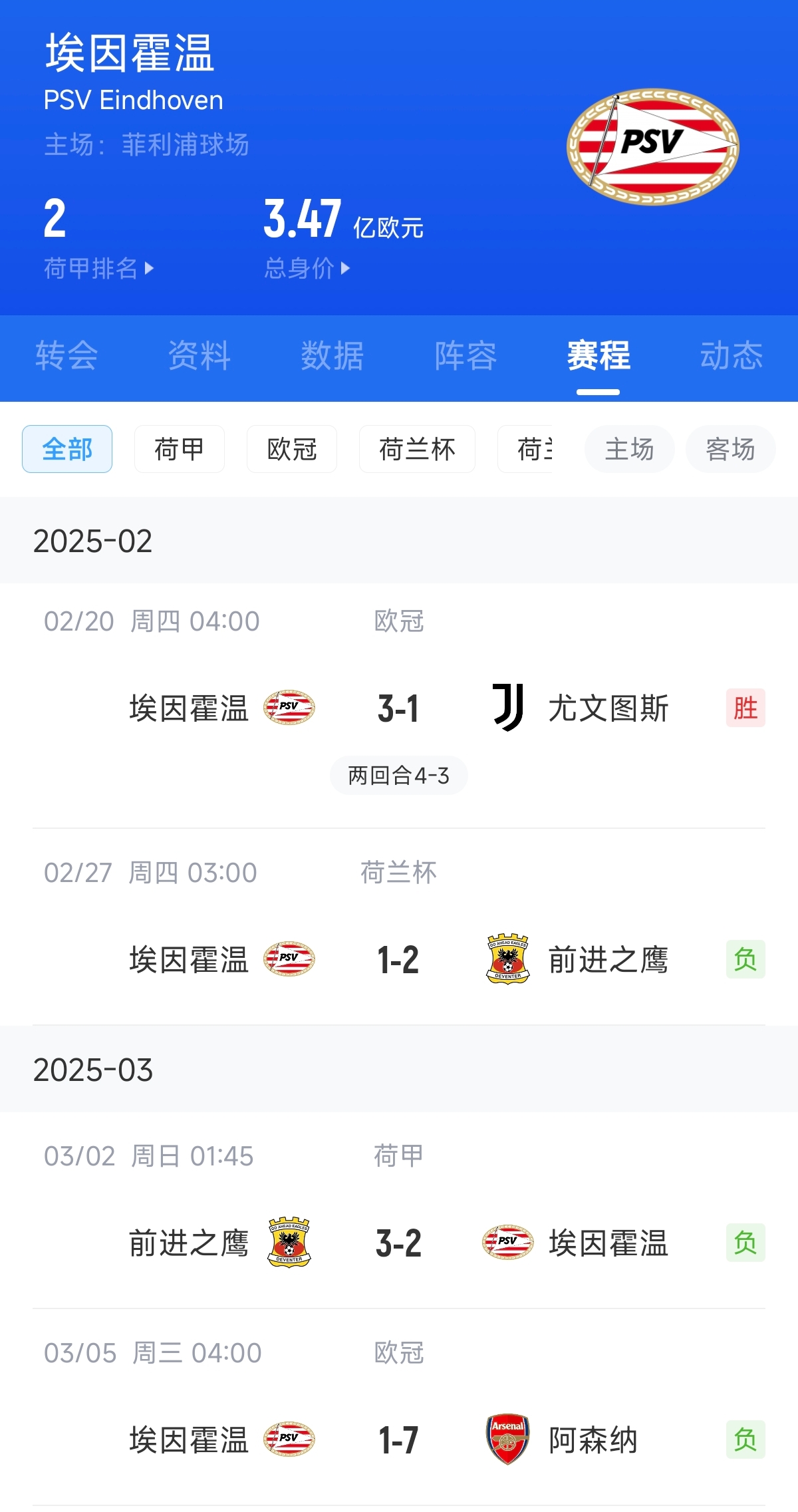 03月05日訊 歐冠16強(qiáng)比賽首回合,埃因霍溫在主場1-7被阿森納擊敗。在歐冠附加賽3-1逆轉(zhuǎn)尤文之后,埃因霍溫各項賽事3連敗。另一場布魯日則是主場1-3不敵維拉,雙殺亞特蘭大后1平2負(fù)1勝難求。