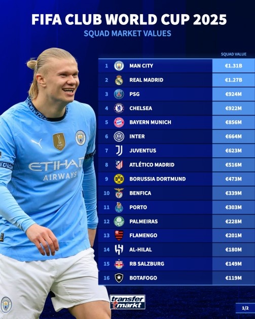 - 世俱杯參賽球隊(duì)身價(jià)排行:曼城13.1億歐居首 皇馬巴黎藍(lán)軍拜仁2-5