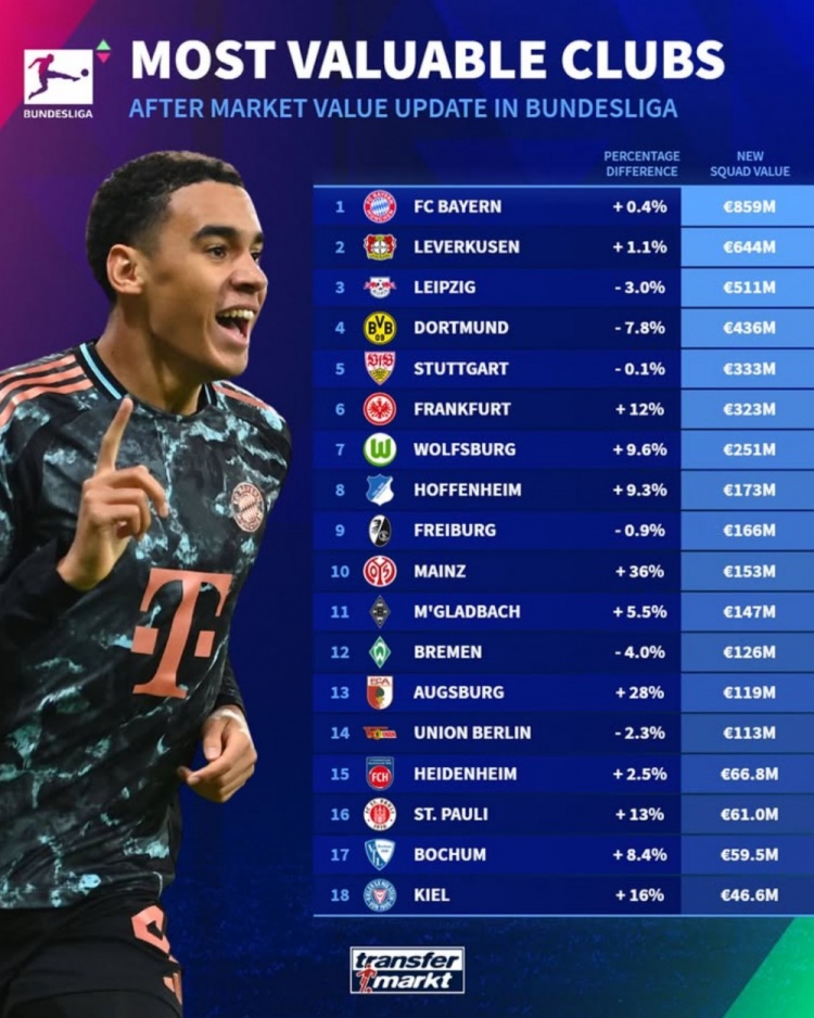 - 德甲球隊德轉身價榜:拜仁8.59億歐居首,藥廠萊比錫二三位