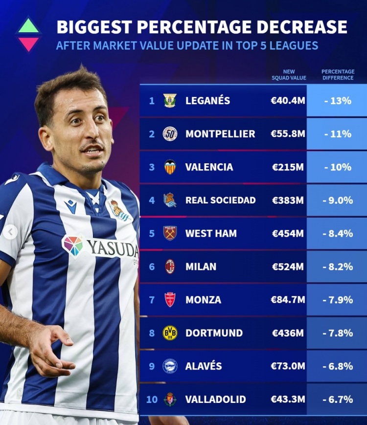 - 五大聯(lián)賽球隊(duì)身價(jià)貶值比例榜:米蘭多特下降約8%,皇社西漢姆在列