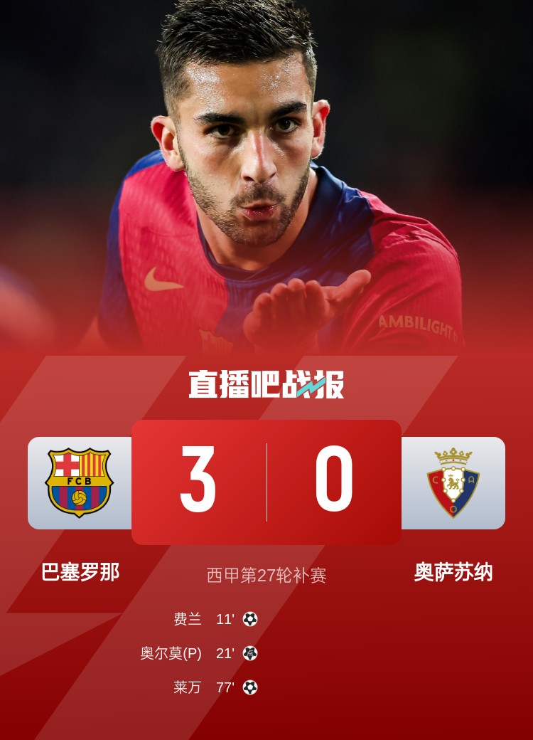 西甲第27輪補賽,巴塞羅那3-0奧薩蘇納,費蘭、萊萬進球,奧爾莫點球+傷退。