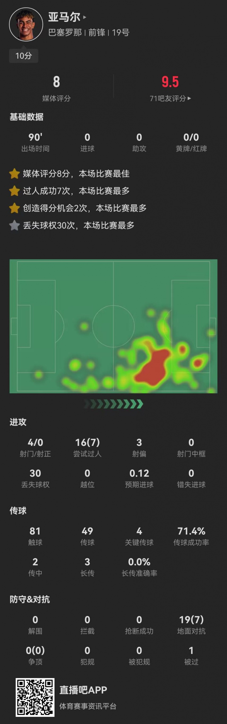 - 亞馬爾本場4射0正+4關鍵傳球 7成功過人+2造良機+30次丟失球權