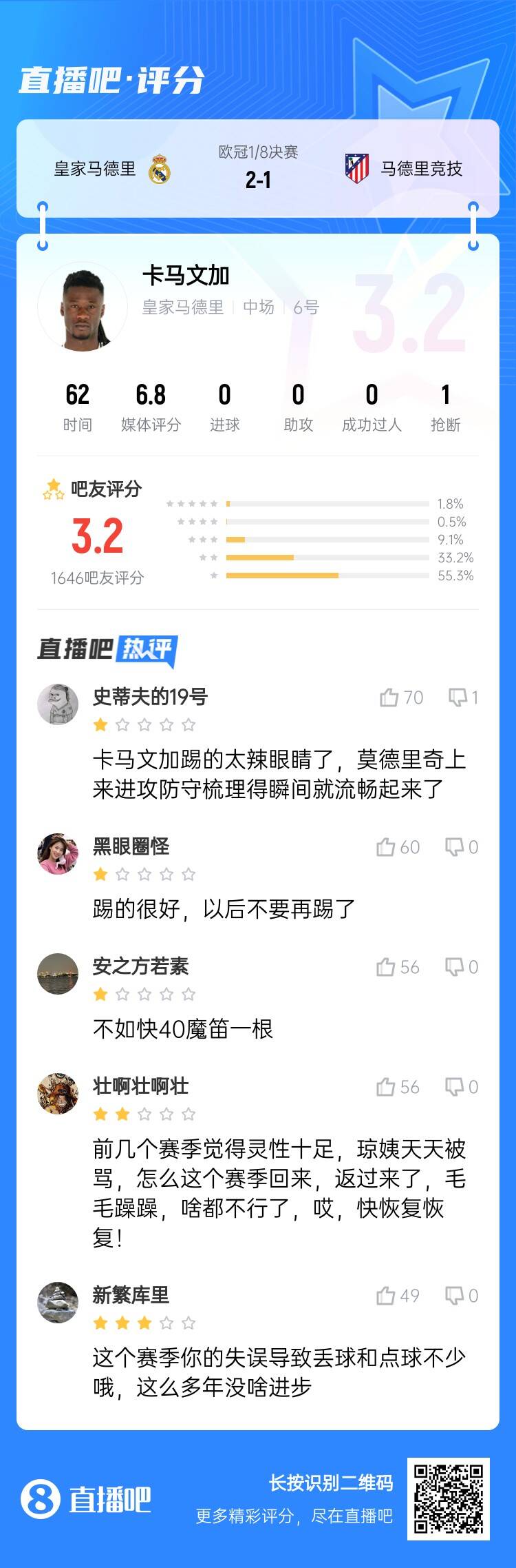 03月05日訊 歐冠1/8決賽首回合,皇馬2-1戰(zhàn)勝馬競(jìng),22歲的皇馬中場(chǎng)卡馬文加本場(chǎng)首發(fā)出戰(zhàn)62分鐘,表現(xiàn)不佳遭球迷痛批。