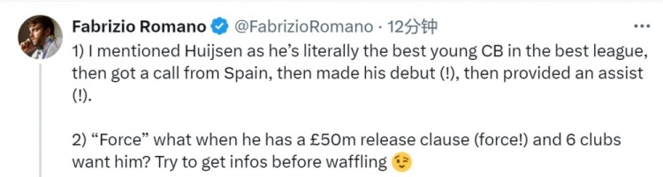 羅馬諾回復(fù)道:“第一,我提到懷森是因為他確實是最佳聯(lián)賽中最為出色的年輕中衛(wèi),他得到西班牙隊的征召,然后上演了國家隊的首秀,并送出助攻?!?/p>