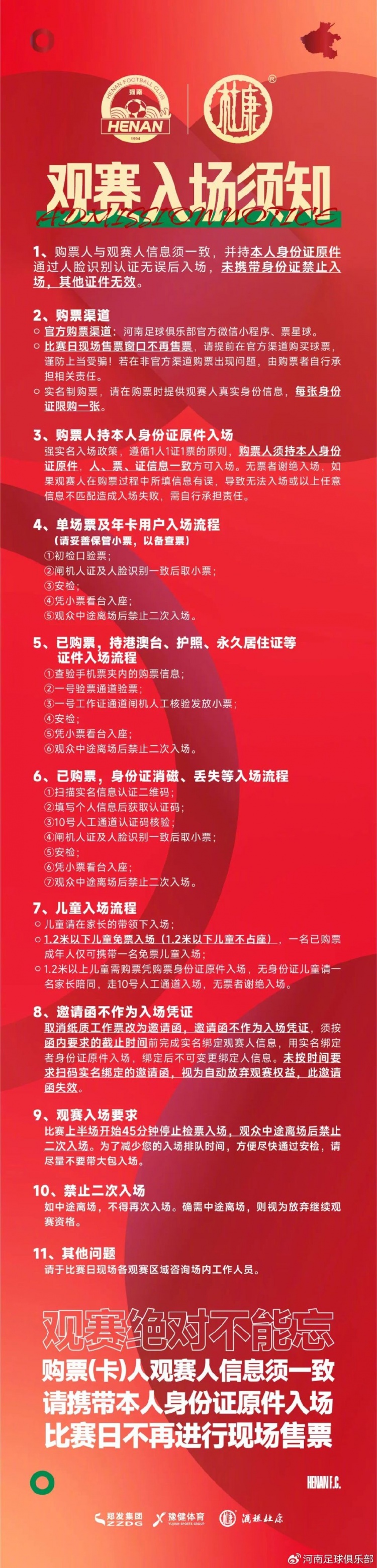 1、應(yīng)河南賽區(qū)公安及反恐部門要求,球迷未攜帶身份證禁止入場,其他證件無效。