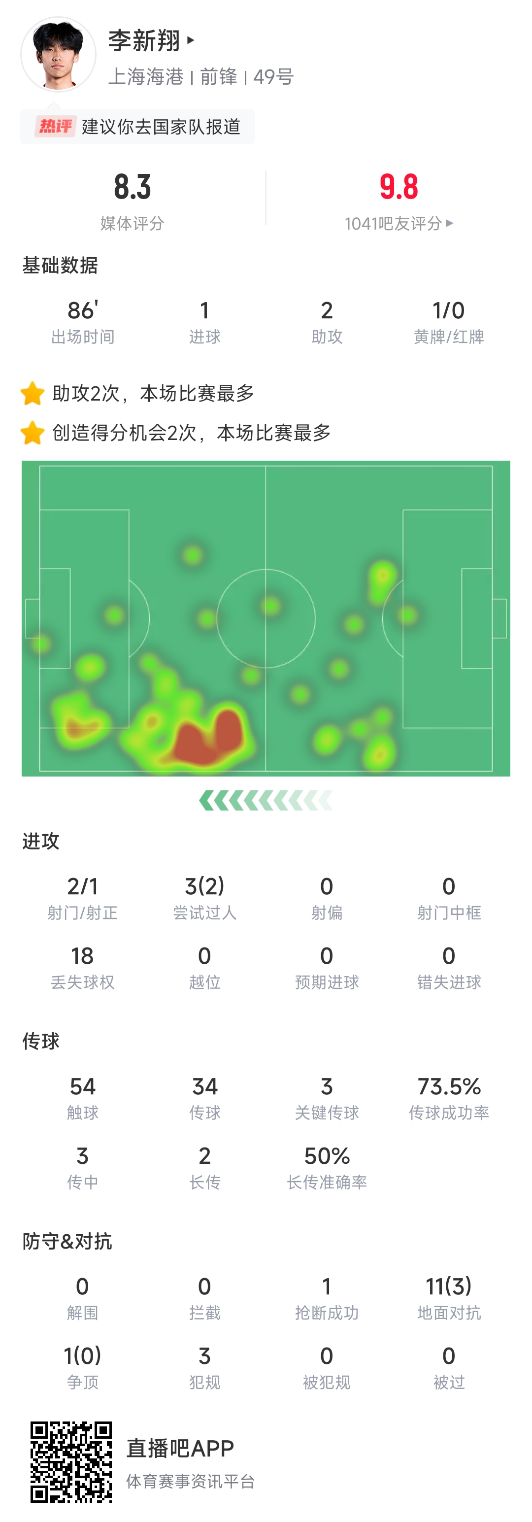 本場比賽海港19歲小將李新翔首發(fā)迎來中超首秀,上半場比賽單挑青島西海岸防線晃過張呈棟抽射收獲處子球,下半場又送出2次助攻,全場比賽1射2傳表現(xiàn)搶眼,幫助海港搶下一分。