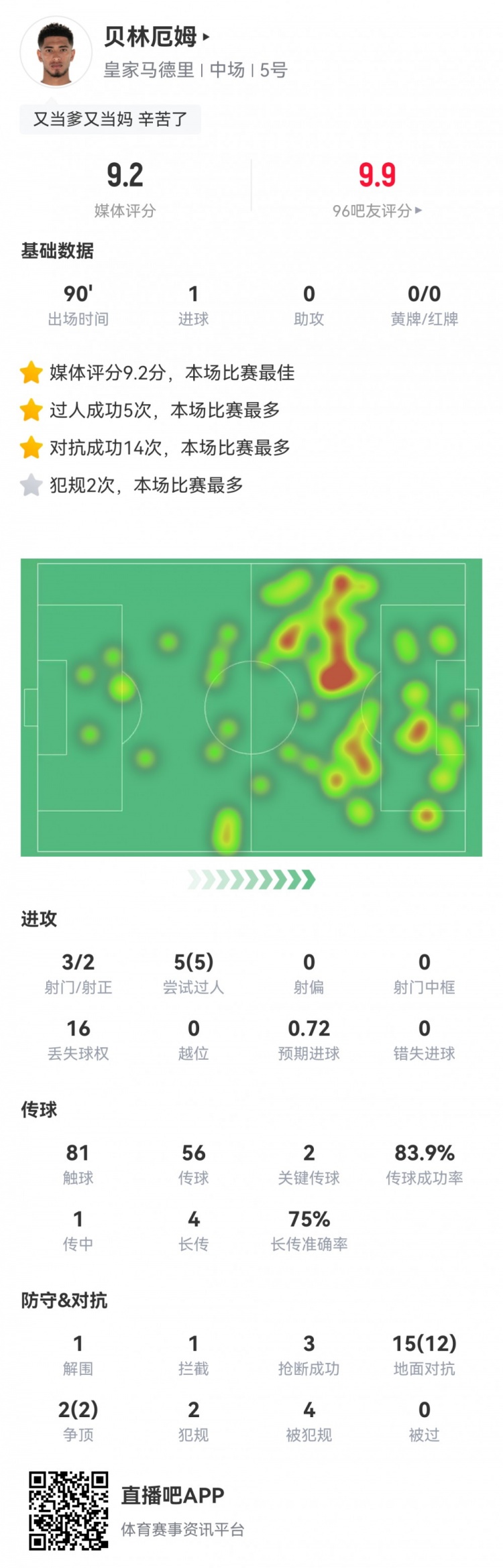 貝林?jǐn)?shù)據(jù):1進(jìn)球,5次過(guò)人全成功,14次成功對(duì)抗,全場(chǎng)最高9.2分
