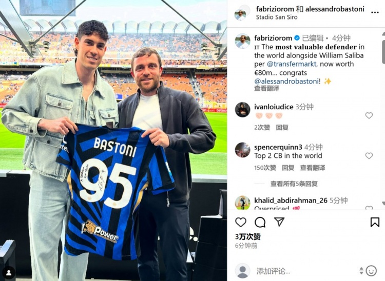 - 羅馬諾社媒曬與巴斯托尼合影:8000萬歐,世界身價(jià)并列最高后衛(wèi)