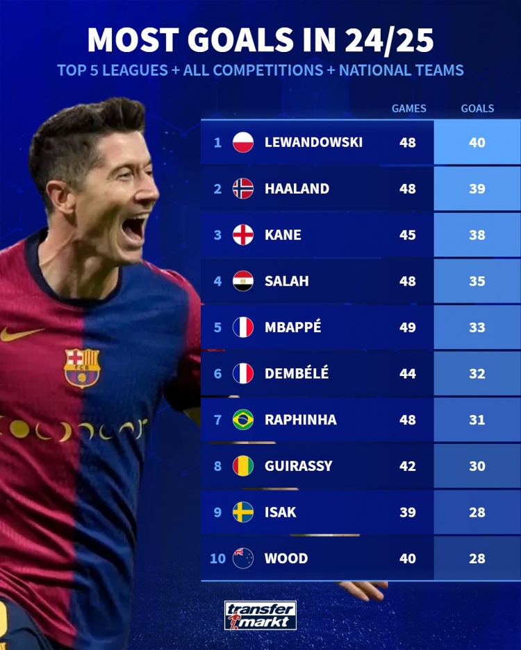 3月31日訊 德國(guó)轉(zhuǎn)會(huì)市場(chǎng)統(tǒng)計(jì)了本賽季五大聯(lián)賽球員所有賽事的進(jìn)球數(shù)量,并列出榜單,36歲萊萬(wàn)以40球居首,哈蘭德、凱恩排名二三位。