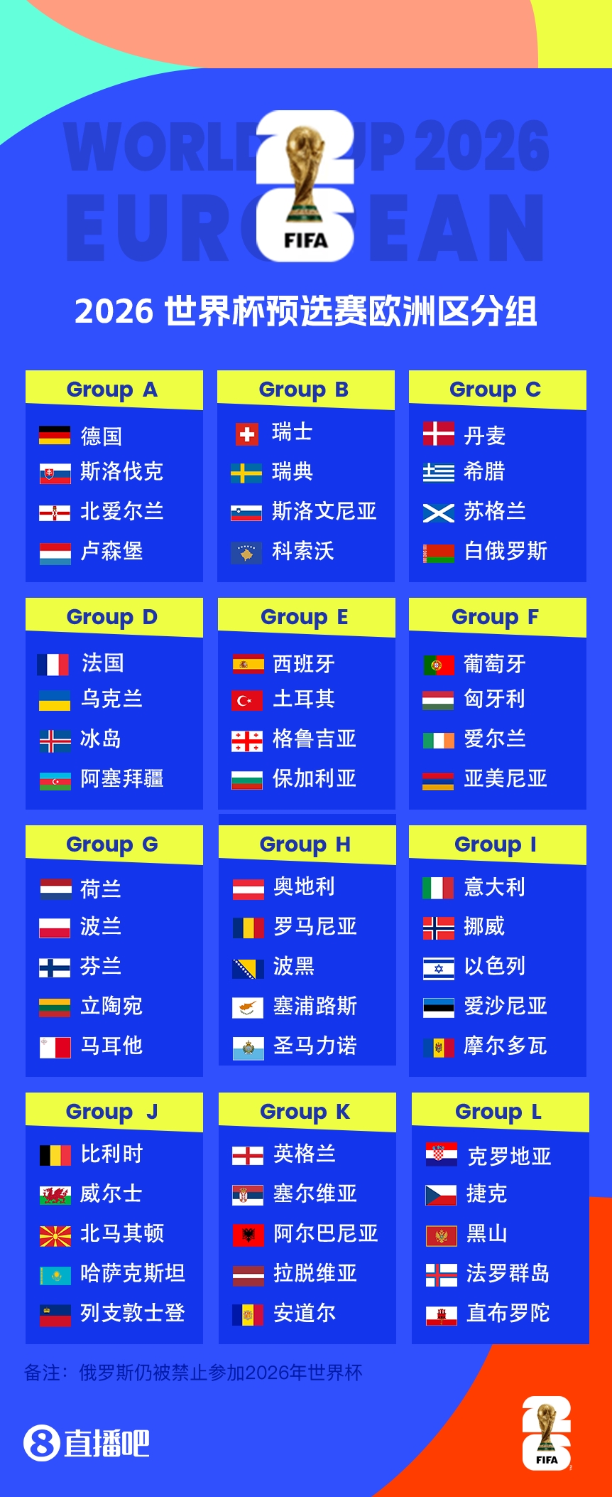 2026年美加墨世界杯歐足聯(lián)共計(jì)有16個(gè)參賽名額,其中12個(gè)小組的頭名將直接獲得世界杯參賽資格,其余4個(gè)席位由12個(gè)小組的第二名通過(guò)附加賽決出。