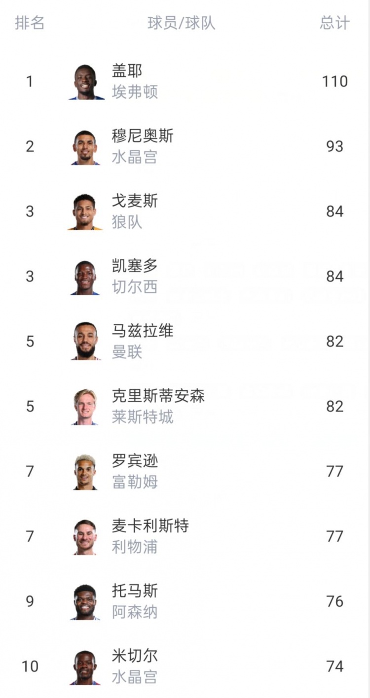 - 110次!埃弗頓中場蓋耶是本賽季英超唯一搶斷次數超100的球員