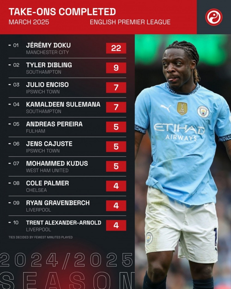 - 英超3月成功過人排名:多庫22次斷層居首,迪布林9次第二