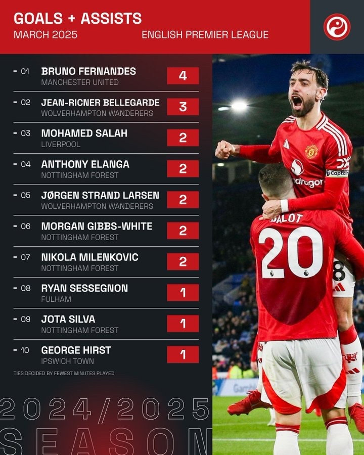 - 英超第一!B費參與了曼聯(lián)在三月份英超比賽中的所有進球