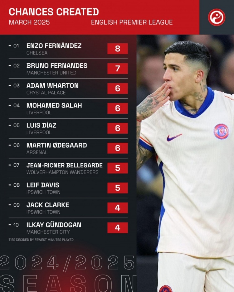 - 英超3月創(chuàng)造機會排名:恩佐8次居首,B費7次&薩拉赫6次