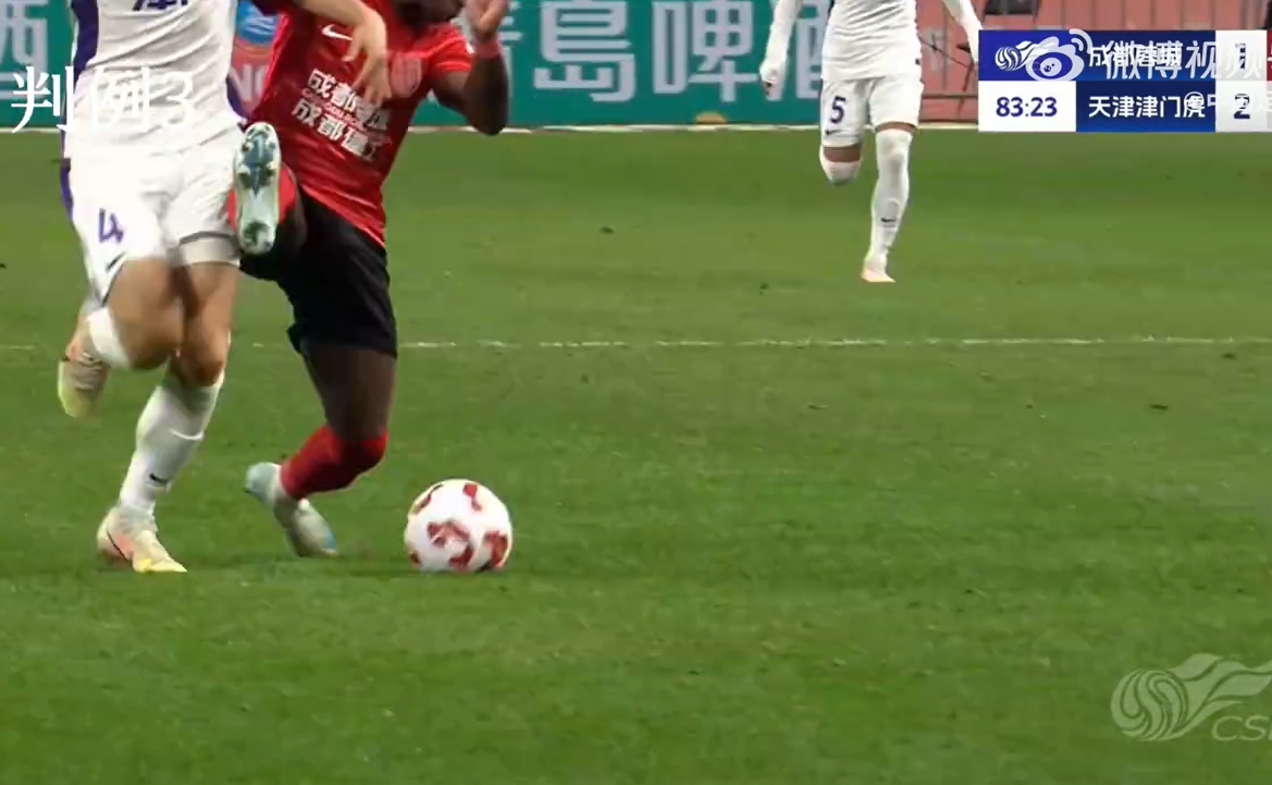 【判例三】:中超聯(lián)賽第2輪,成都蓉城VS天津津門(mén)虎,比賽第84分鐘,天津津門(mén)虎4號(hào)隊(duì)員在爭(zhēng)搶球時(shí)疑似踩踏成都蓉城47號(hào)隊(duì)員,裁判員判罰天津津門(mén)虎4號(hào)犯規(guī),未出示紅黃牌,VAR未介入。