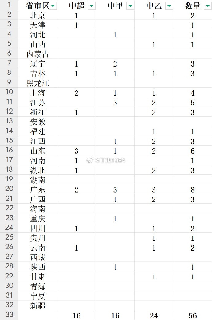 三級職業(yè)聯(lián)賽球隊分布:廣東省8隊最多,山東省6隊第二江蘇省第三
