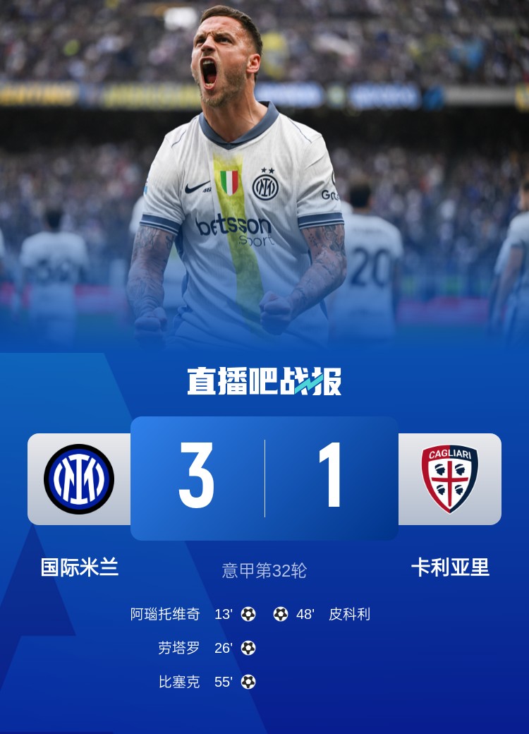 意甲第32輪,國米3-1卡利亞里,阿瑙托維奇?zhèn)魃?,勞塔羅進球。