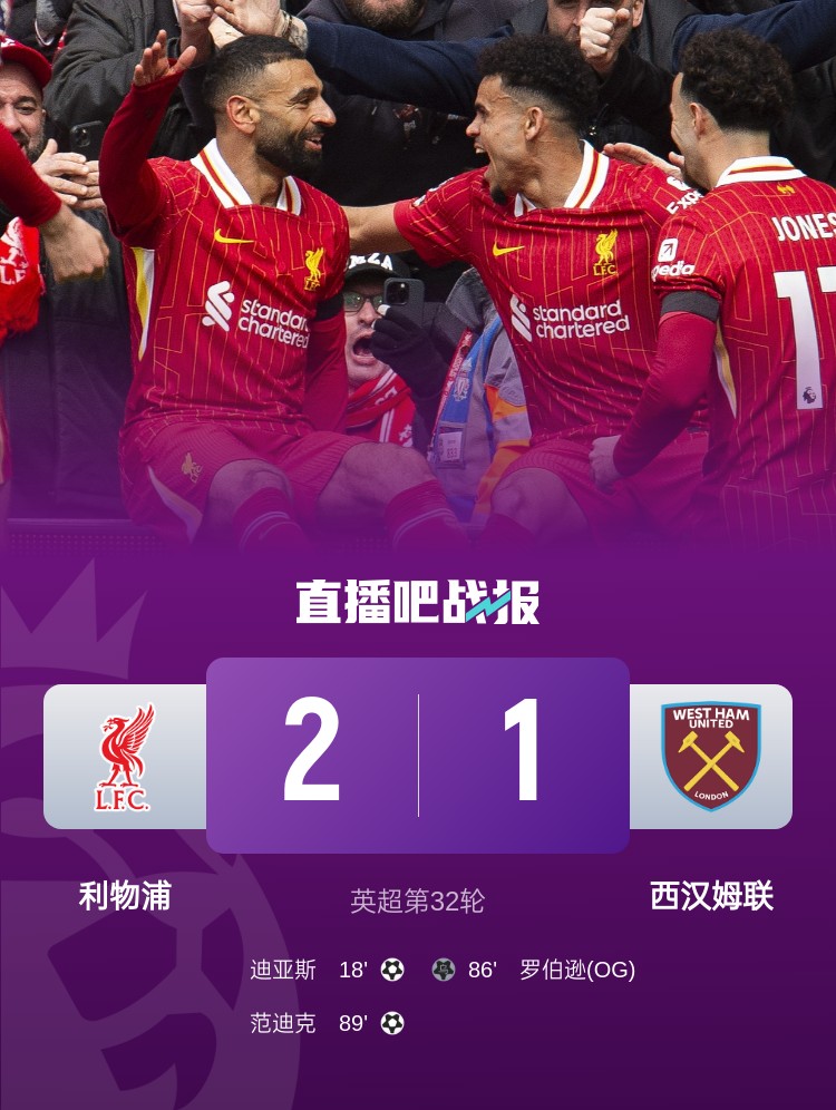 薩拉赫助攻路易斯-迪亞斯破門,范迪克建功,最終利物浦2-1西漢姆,13分領跑積分榜。