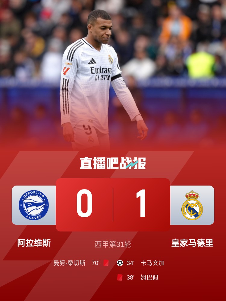 卡馬文加世界波迎聯賽首球,姆巴佩兇狠蹬踏對手小腿被直紅罰下,最終十人皇馬客場1-0戰(zhàn)勝十人阿拉維斯。