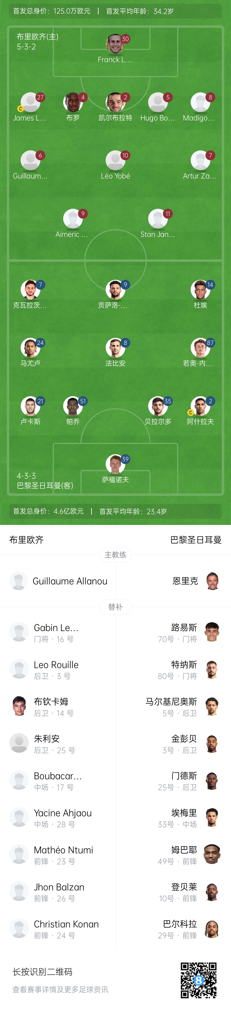 02月26日訊 法國(guó)杯1/4決賽,布里歐齊主場(chǎng)vs巴黎圣日耳曼即將打響。賽前首發(fā)出爐。