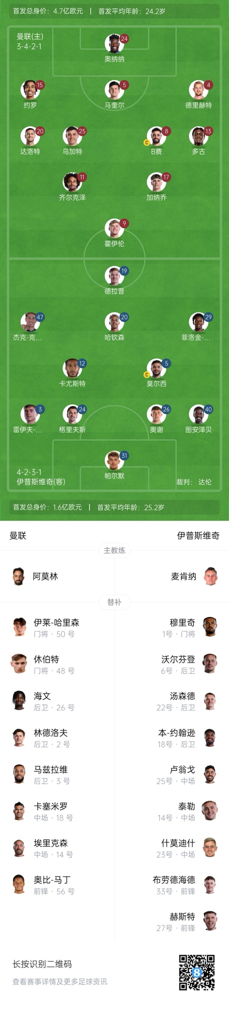曼聯(lián)首發(fā):24-奧納納、4-德里赫特、5-馬奎爾、15-約羅、20-達(dá)洛特、25-烏加特、8-B費(fèi)、13-多爾古、17-加納喬、11-齊爾克澤、9-霍伊倫